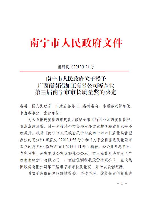 據悉,南寧市市長(cháng)質(zhì)量獎是由南寧市人民政府設立的最高質(zhì)量榮譽(yù),專(zhuān)門(mén)授予南寧市實(shí)施卓越績(jì)效質(zhì)量管理模式,質(zhì)量水平和自主創(chuàng )新能力在廣西同行業(yè)處于領(lǐng)先地位,并取得顯著(zhù)經(jīng)濟效益和社會(huì )效益的企業(yè)或組織。