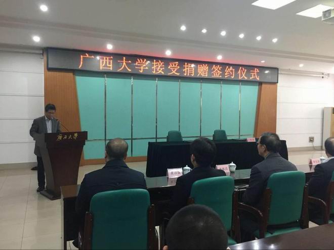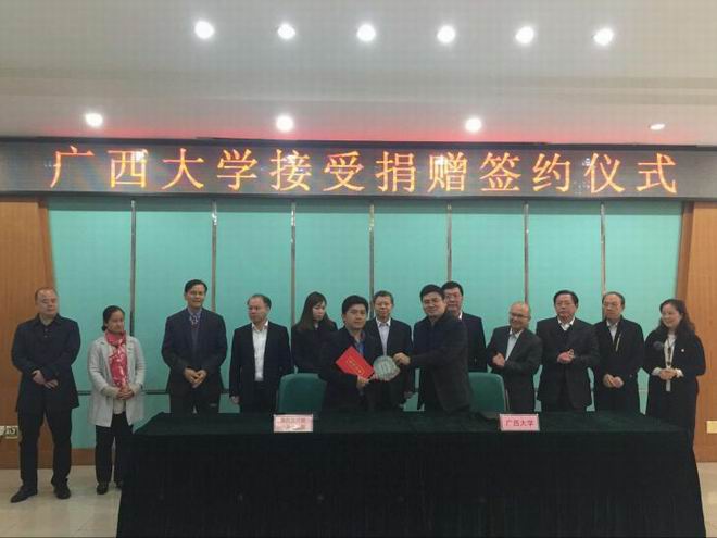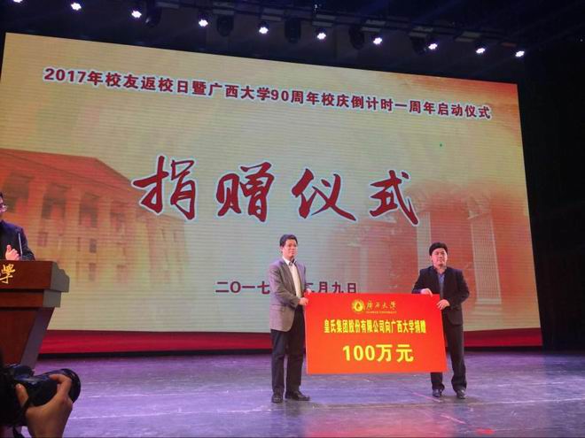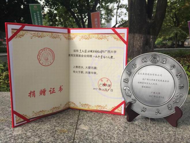 2017年12月9日,皇氏集團參加“廣西大學(xué)2017年校友返校日暨廣西大學(xué)90周年校慶倒計時(shí)1周年啟動(dòng)儀式”活動(dòng)并在捐贈儀式上捐贈100萬(wàn)元,為莘莘學(xué)子帶去一份暖冬的愛(ài)心支持,皇氏集團人力資源總監莫孫誠、行政部經(jīng)理石愛(ài)萍出席了儀式。