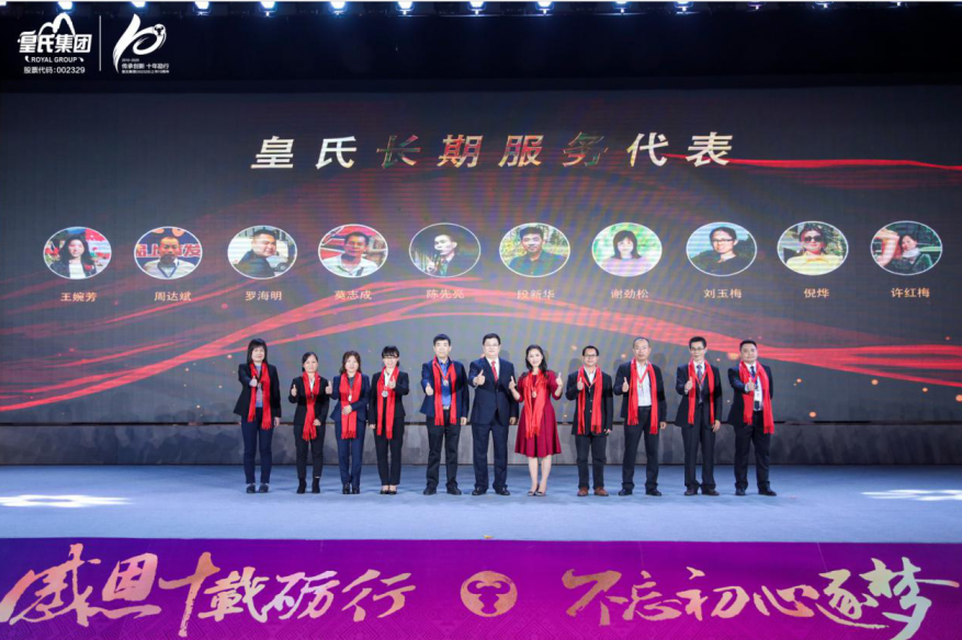 發(fā)布會(huì )后,皇氏集團特別表彰了為集團發(fā)展作出卓越貢獻的感動(dòng)皇氏之星,并且為長(cháng)期支持和陪伴皇氏成長(cháng)的老員工頒發(fā)了榮譽(yù),董事長(cháng)黃嘉棣為在公司服務(wù)超過(guò)1015年的員工代表授予定制“十周年紀念”會(huì )徽的榮譽(yù)獎牌,以感謝他們長(cháng)期以來(lái)的陪伴與付出。