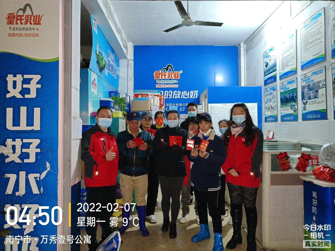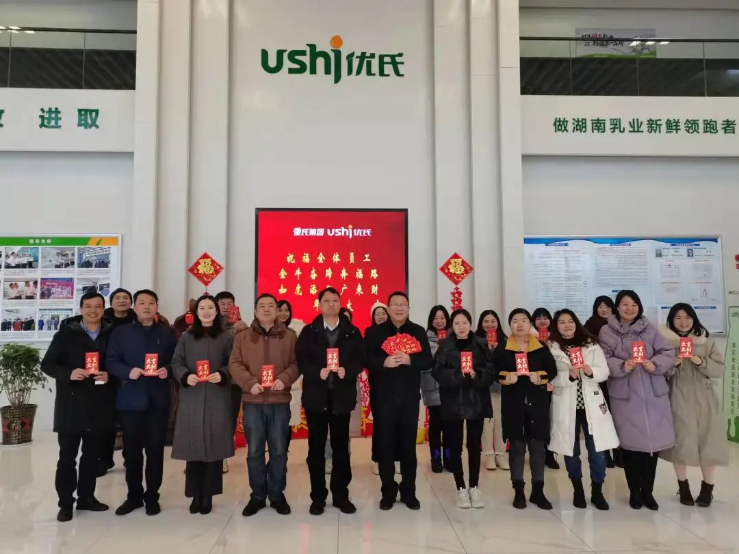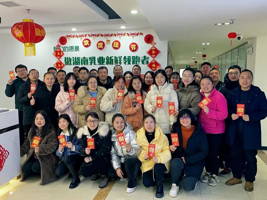 在集團總部,皇氏集團副董事長(cháng)何海晏、副總裁王鶴飛、王婉芳、滕翠金攜皇氏乳業(yè)集團高管團隊、廣西皇氏乳業(yè)管理團隊全新亮相,為員工送上新春祝福和開(kāi)工紅包,把暖暖春意和關(guān)愛(ài)送給每一名員工。象征著(zhù)新的一年大吉大利、一帆風(fēng)順的開(kāi)年紅包,給每一位員工的臉上增添了一份喜氣。
